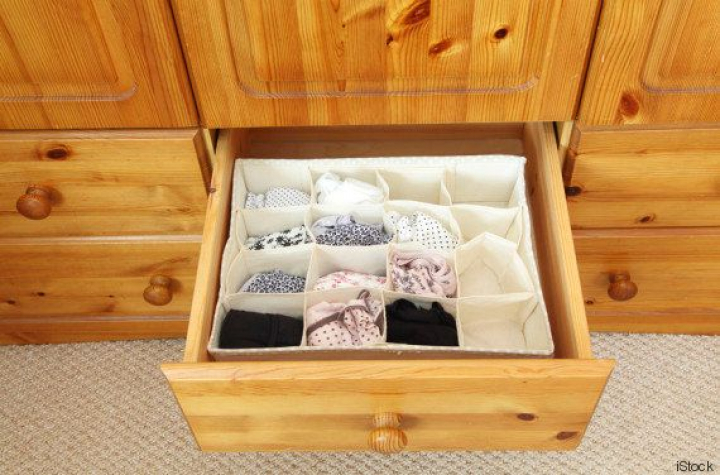 8. Y dentro de los cajones. También se puede seguir acotando el espacio. Puedes utilizar cestas de ganchillo, por ejemplo, para guardar complementos pequeños, cremas, pañuelos, etc. Además, para la bisutería una buena idea sería añadir una balda con un accesorio de fieltro.