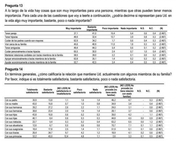Tras ese planteamiento inicial, el CIS continúa: "Para cada una de las cuestiones que voy a leerle a continuación, ¿podría decirme si representan para usted en la vida algo muy importante, bastante, poco o nada importante?" Esos enunciados son tener pareja, tener hijos, cuidar de los padres cuando son mayores, vivir cerca de la familia, tener amigos, cuidar personalmente de los hijos, mantener relaciones cordiales con los miembros de la familia, apoyar emocionalmente a los miembros de la familia y, por último, apoyar económicamente a los miembros de la familia. Después, el cuestionario pide indicar cómo de satisfactoria es la relación con los distintos miembros de la familia.