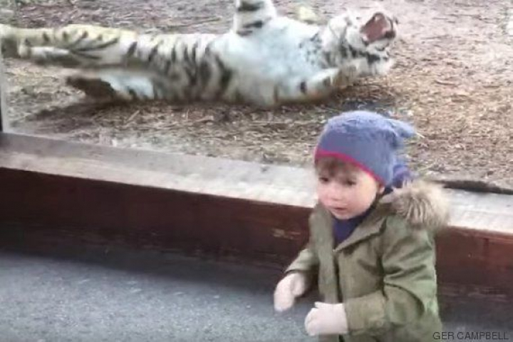 Es difícil decidir qué reacción es mejor: la del tigre al ser despertado o la del niño que estaba mirando y sale pitando al escuchar el rugido. Inevitable acordarse de aquel niño que escapaba corriendo al oír rugir a su abuelo.
