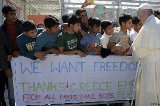 El papa Francisco ha implorado desde el centro de detención de Moria, en la isla griega de Lesbos, donde se encuentran cerca de 3.000 refugiados, "una solución" de Europa a la crisis de estos exiliados forzosos. Así lo ha reclamado durante su discurso ante unos 400 migrantes con los que se ha encontrado. Las personas retenidas en este campo han recibido al pontífice con pancartas, entre lloros y en medio de gritos de "libertad". Francisco iba acompañado por el Patriarca Ecuménico de Constantinopla Bartolomé y por el arzobispo de Atenas y toda Grecia Jerónimo.