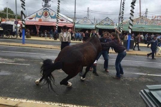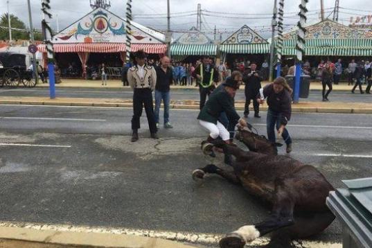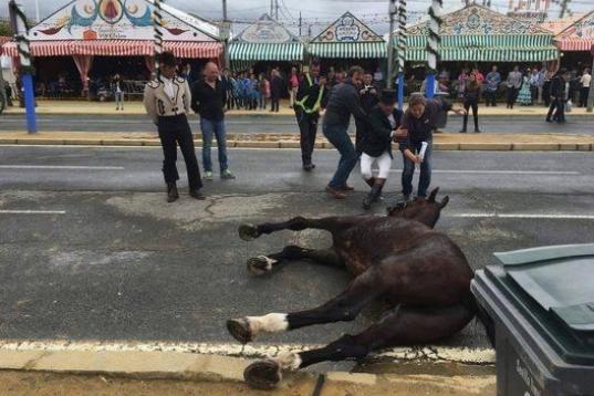 El Partido Animalista PACMA ha difundido en Facebook una secuencia de fotos en las que se muestra a un caballo en la Feria de Abril de Sevilla, completamente reventado por el esfuerzo que se le exige a estos animales en los días de fiesta, con jornadas eternas, calor y frío, contacto masivo con la gente.