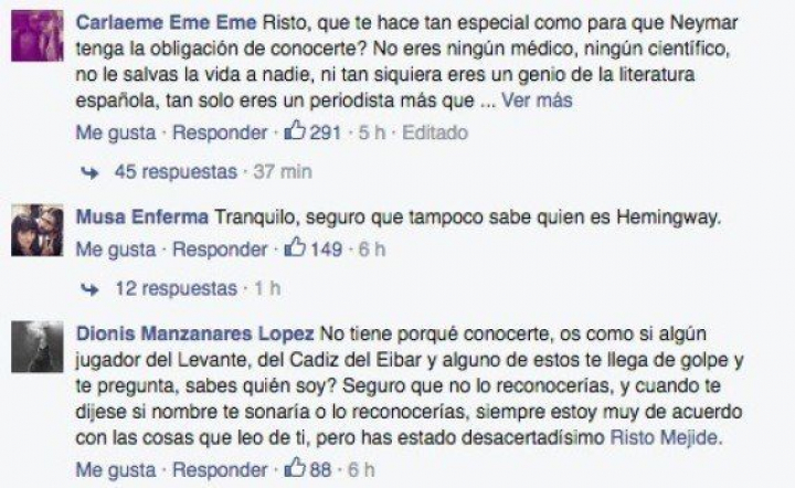 Eso era todo. Pero el chasco o corte colgado por Risto en sus cuentas personales de Facebook e Instagram no tuvo precisamente buena acogida entre sus fans. "Risto, ¿qué te hace tan especial como para que Neymar tenga la obligación de conocerte?", rezaba el primer comentario. Y como este, decenas. Son muchos los fans que le preguntan qué modestia hay en preguntar a alguien si te conoce. Aquí los tienes todos. ¿Qué opinas?
