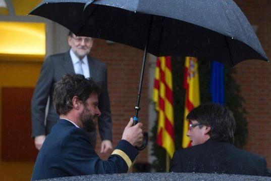 Puigdemont ha llegado poco después de las cinco de la tarde al complejo de la Presidencia del Gobierno y en medio de la lluvia y tras descender del vehículo en el que se ha desplazado hasta allí, ha sido saludado por Rajoy en la escalinata de acceso al edificio principal de la Moncloa.
