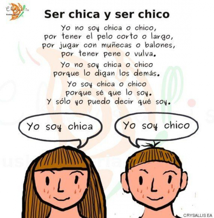"Hasta ahora -señala Chrysallis- en los centros escolares se ha transmitido el planteamiento: chico-pene y chica-vulva", algo que, a su juicio, "no es correcto y niega la existencia de una parte de las niñas y los niños".