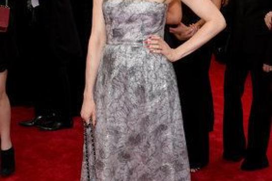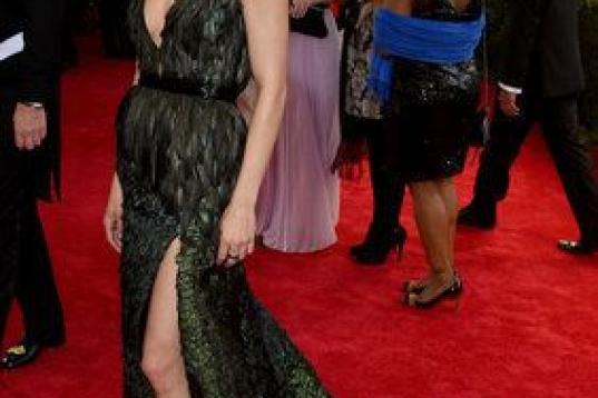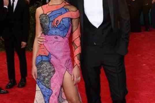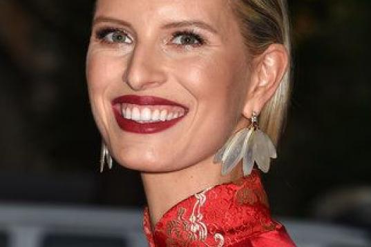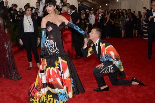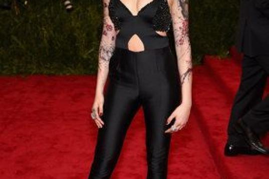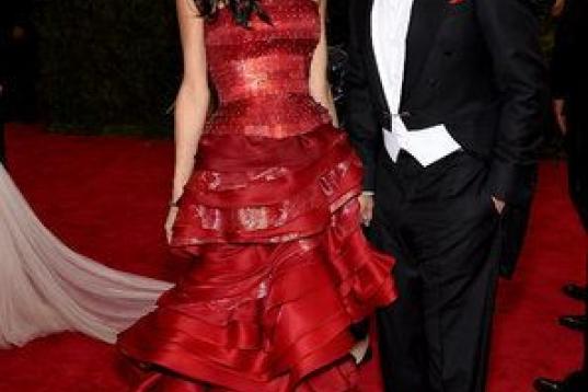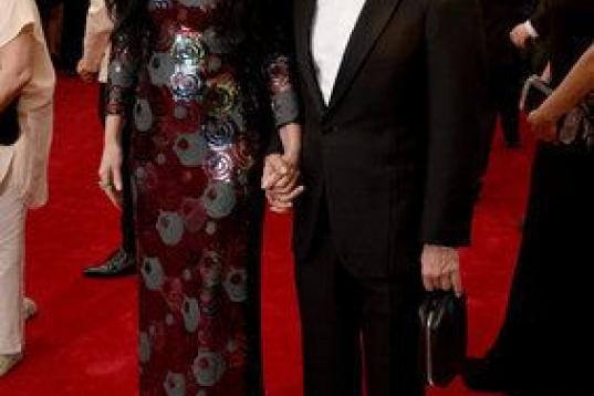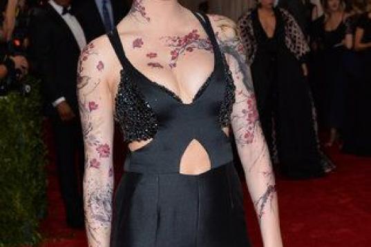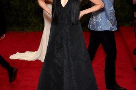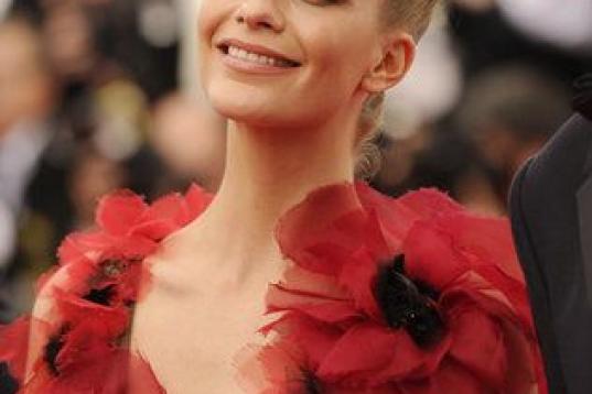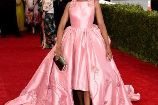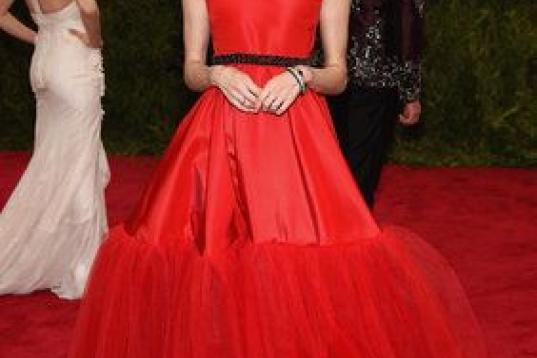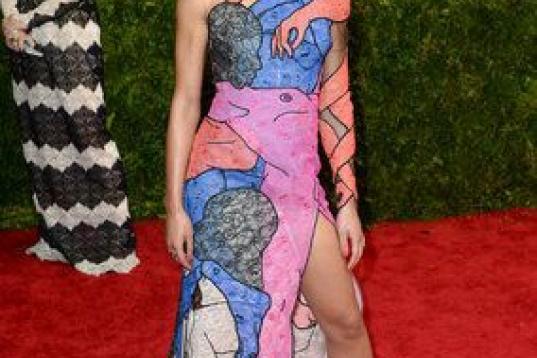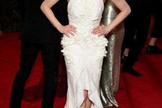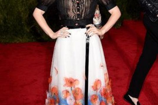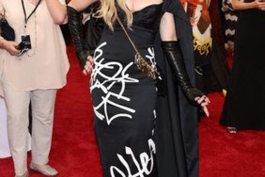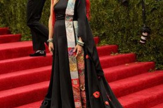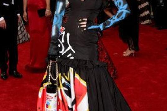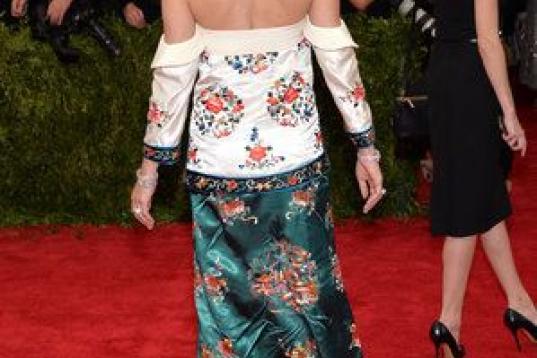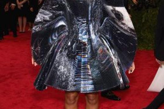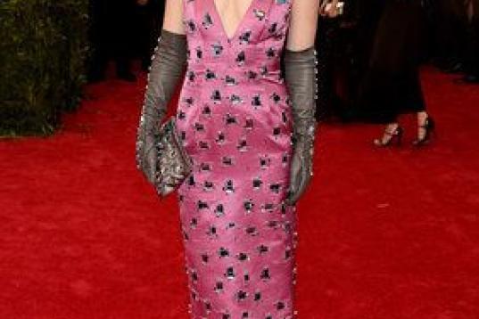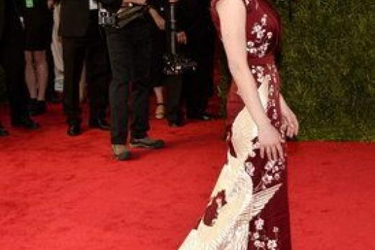 El vestido está decorado con broches de Cindy Chao y adornado con un tocado de Philip Treacy.