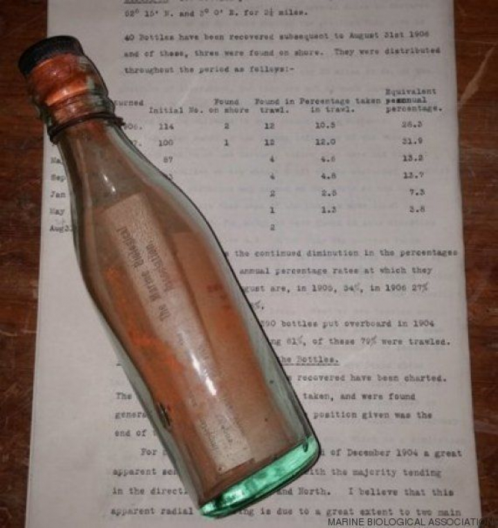 Según el diario The Guardian, el biólogo marino George Parker Bidder fue quien lanzó la botella en la zona sur del mar del Norte en 1906, concretamente el 30 de noviembre. Fue una de las más de mil botellas que Bidder soltó al mar como parte de sus investigaciones acerca de los patrones que siguen las corrientes oceánicas.