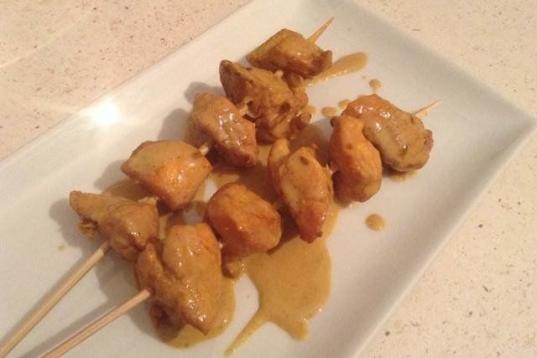 En realidad es una brocheta acompañada de una salsa hecha a base de cacahuetes, leche de coco y curry. Puedes ver la receta en Cookpad.