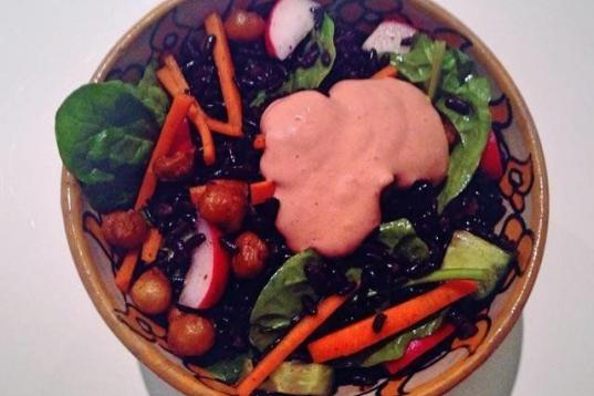 "Un plato sano y completo, con arroz negro, garbanzos al curry, zanahorias, rábanos, pepino, espinacas y un aliño cremoso de fresas y mostaza", escribe su autora. Prepara el plato siguiendo esta receta.