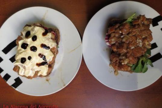 Salmón, cebolla, limón, brotes tiernos, pan casero, aceite de oliva virgen extra, salsa de soja, ajo, vinagre de Módena, Jägermeister y mostaza antigua, ajonesa o guacamole.