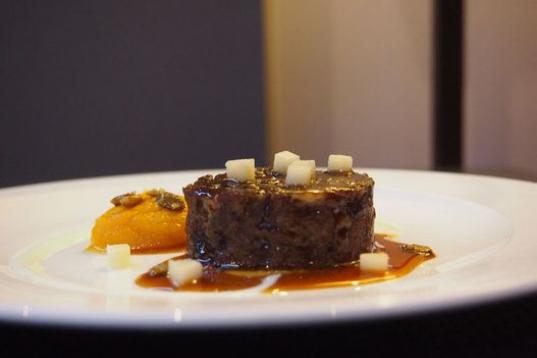 Rabo de buey, queso de Radiquero, fondo blanco de ternera, calabaza, mantequilla, pipas de calabaza y Jägermeister.