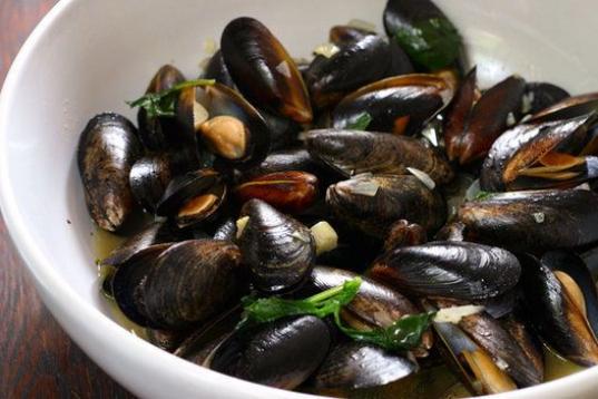 Mejillones, 1/4 taza de Jägermeister, 1/4 taza de cebolla picada, 2 dientes de ajo picados, zumo de un limón, 2 cucharadas de mantequilla, 1 cucharada de aceite de oliva, sal y hojas de albahaca fresca.