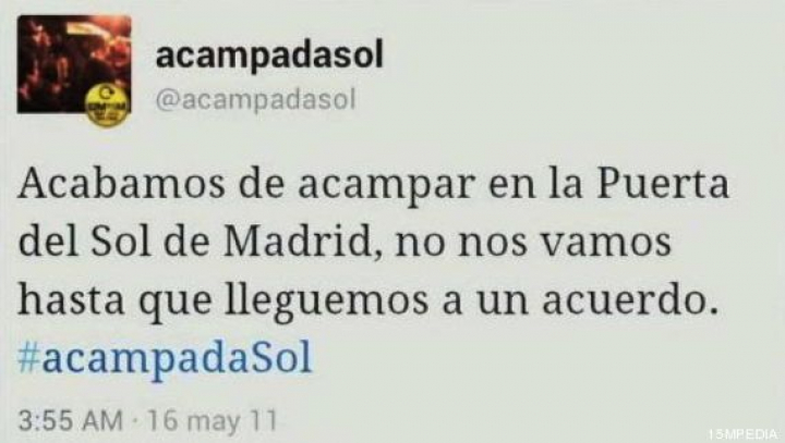 Con este tuit anunciaron el inicio de la acampada en la madrugada del 15 al 16 de mayo