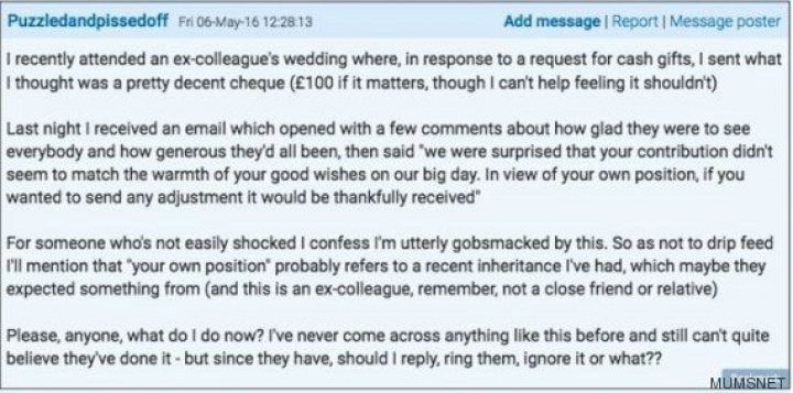 El 6 de mayo, una usuaria anónima de nombre Puzzledandpissedoff [que podría traducirse por 'perpleja y cabreada'] abrió el debate en el foro Mumsnet para compartir su historia y pedir consejo sobre cómo podía actuar. Según lo que publica, la pareja de la boda había pedido que los regalos fueran dinero, así que la invitada —antigua compañera de la novia— les envió un cheque de 100 libras (aproximadamente, 130 euros).