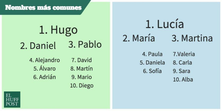 Para extraer estos datos, el organismo ha estudiado las 426.303 inscripciones realizadas en el Registro Civil en 2014 y a partir de ahí ha extraído cuáles han sido los 100 nombres más comunes en España durante ese periodo. Así a Hugo le siguen Daniel, Pablo, Alejandro, Álvaro y Adrián, y detrás de Lucía van María, Martina, Paula, Daniela y Sofía. En el número cien de la lista masculina está Yeray y en la femenina está Anna.