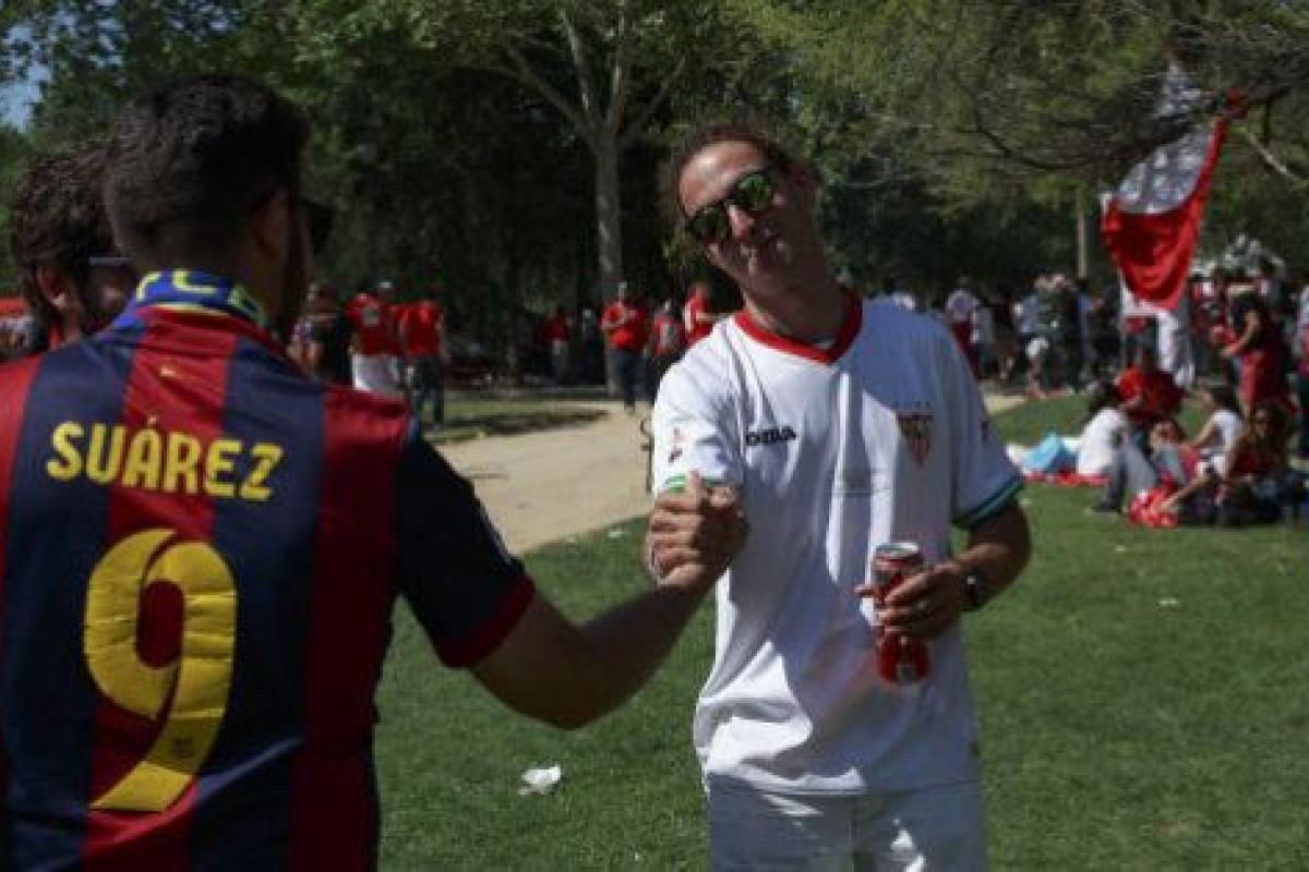 Las aficiones del Sevilla y del Barcelona han pasado el día en Madrid sin que se haya registrado ningún incidente entre seguidores de ambos clubes. Tanto sevillistas como blaugranas han convivido de forma pacífica en el día de la final y el encuentro entre ambas aficiones ha dejado imágenes muy bonitas de lo que debe ser una final de fútbol.
