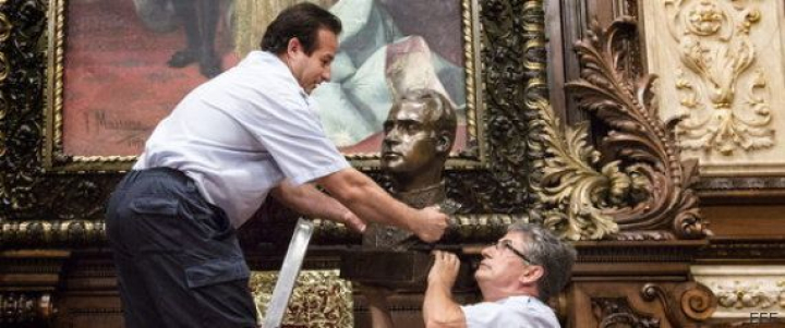 La vara de mando se entrega al alcalde en esta dependencia de la planta noble del hoy ayuntamiento de Barcelona en plena plaza de Sant Jaume. Se respiran los siglos de historia. Por primera vez, el destino de la ciudad está regido por una mujer, Ada Colau (Barcelona En Comú), que ganó las elecciones hace un año y que se ha convertido en uno de los iconos de los consistorios del cambio.