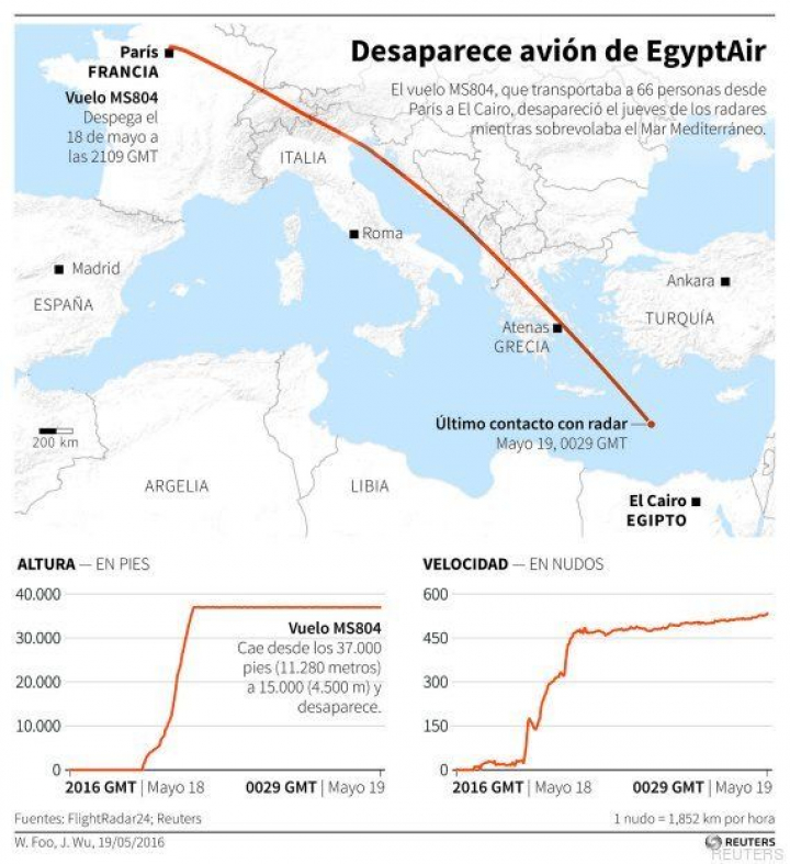 El vuelo MS804 de EgyptAir desapareció de los radares en la madrugada del 19 de mayo poco después de entrar en el espacio aéreo egipcio cuando realizaba la ruta entre París y El Cairo con 66 personas a bordo.