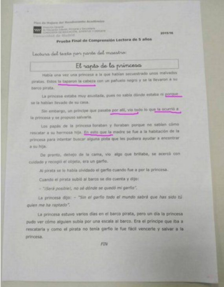 Según El País, la prueba consistía en leer un cuento titulado El rapto de la princesa donde aparecían repetidos laísmos y errores semánticos y gramaticales. El texto hablaba de una niña secuestrada por unos piratas. Sus padres "lloraban y lloraban" al enterarse, mientras un príncipe que "lo vio todo lo que la ocurrió a la princesa se propuso salvarla".
