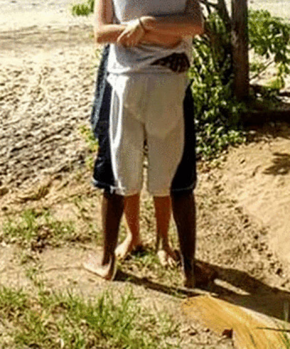 En realidad, es muy sencillo: el bañador del chico es bicolor, por lo que tanto la parte lateral blanca como la central azul cubren sus piernas (y no las de la chica, como podría parecer al primer vistazo).