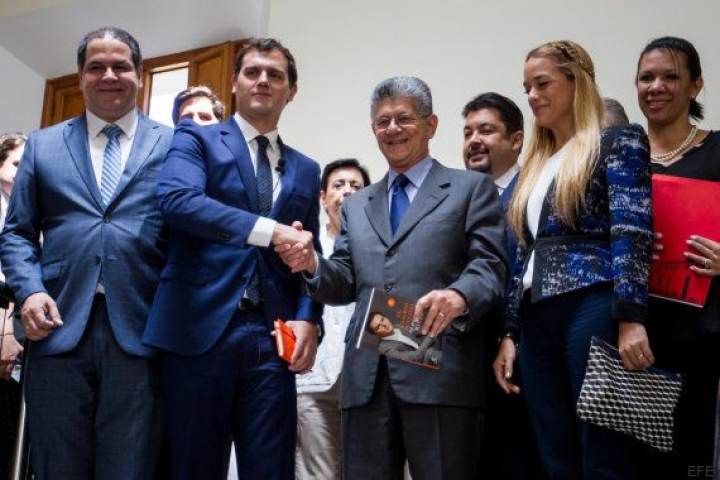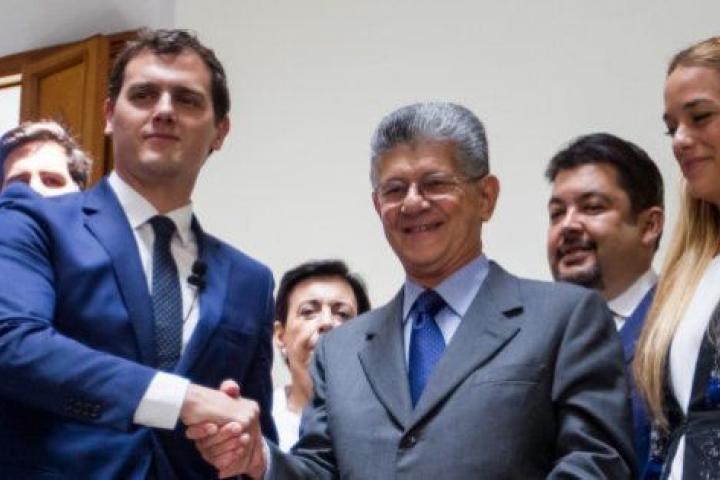 El líder de Ciudadanos, Albert Rivera, ya ha conocido al presidente de la Asamblea Nacional Venezolana, Henry Ramos Allup, que le ha recibido este martes en la sede del Parlamento, donde el político catalán dará un discurso en una sesión especial de la Comisión de Política Interior.