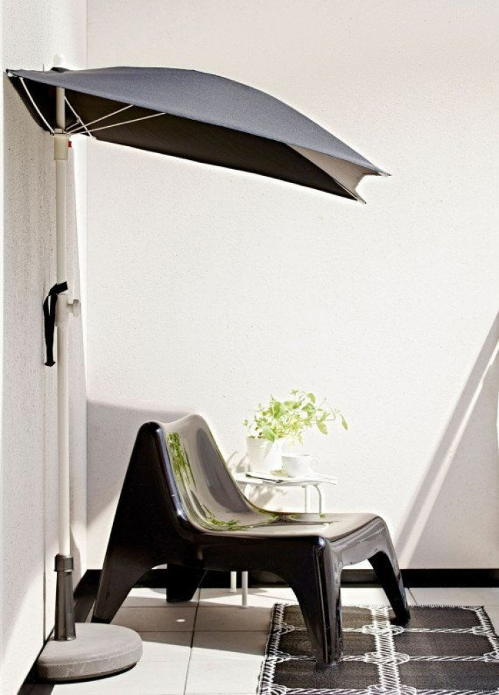 Uno de los dilemas de tener un espacio pequeño es el sol. Normalmente una sombrilla estándar no cabe en una terraza de espacio reducido. Y si cabe, seguro que ocupa muchísimo espacio. Por eso se pueden buscar alternativas. Una de ellas es esta sombrilla BRAMSÖN de Ikea, que está diseñada para poder colocarse pegada a una pared, así no hará falta un espacio excesivamente grande.