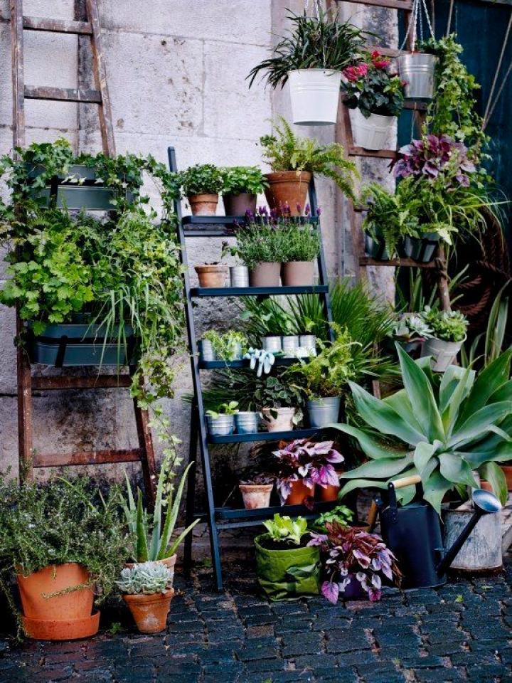 Los muebles son también un factor importante a tener en cuenta si tienes una terraza pequeña. Una estantería para guardar los trastos pegada o empotrada a la pared es una buena opción para meter todo lo que te ocupe espacio y no estés usando. También sirve para colocar las macetas y que no estén todas por el suelo. Tendrás más sitio para moverte y la disposición de las plantas le dará un toque más salvaje al lugar.