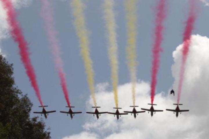 Han presidido el homenaje a los que dieron su vida por España y un desfile protagonizado por 734 militares, en el que no ha faltado el vuelo de la patrulla Águila, formada por siete aviones C-101, dibujando en el aire los colores de la enseña nacional.