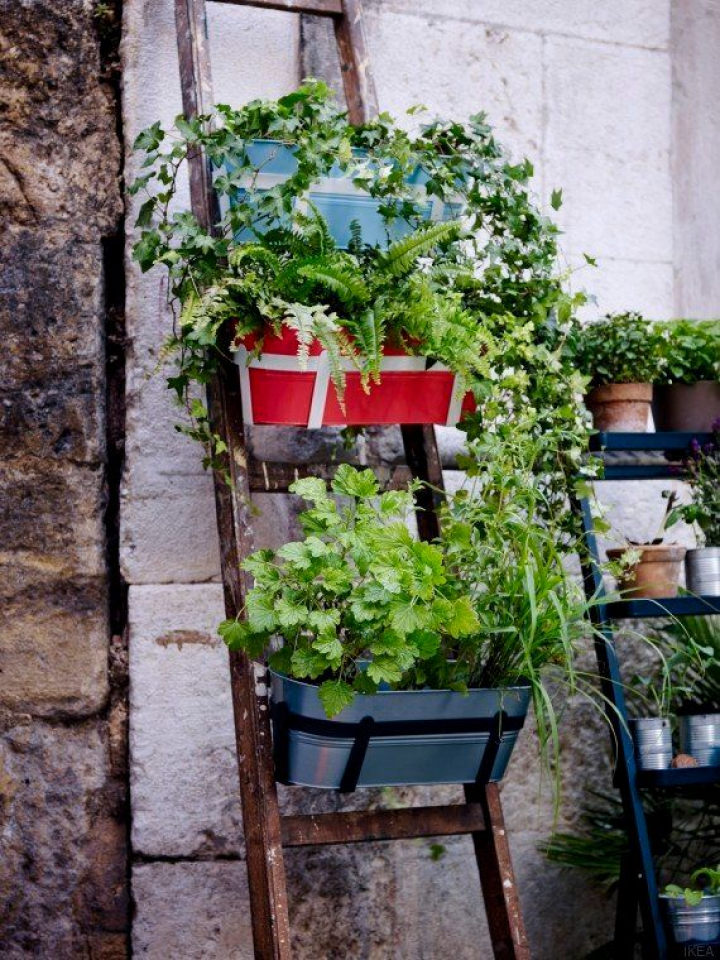 Las opciones para colgar del techo son las más económicas, pero también hay escaleras para apoyar el jardín contra la pared o muebles para que ocupe como una lámpara de pie (especial para que las trepadoras adquieran formas de fantasía). Los manitas tienen la opción de reciclar un palet como en esta foto.