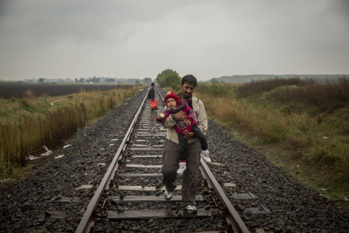 Olmo Calvo, otro de los fotógrafos de la exhibición, realizó esta foto en la frontera de Serbia que cruza a Hungría, actualmente cerrada. Cuando los refugiados pasaban a Hungría caminaban por las vías del tren muchos kilómetros y cuando podían se desplazaban en coche o en autobús.