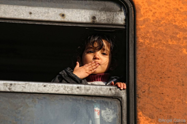 Esta imagen de Colina fue tomada en un tren con refugiados que estaba descargando. "Me mira y empieza a lanzarme besos, le hice las fotos mientras me entraban ganas de llevármela a casa. Un flechazo".