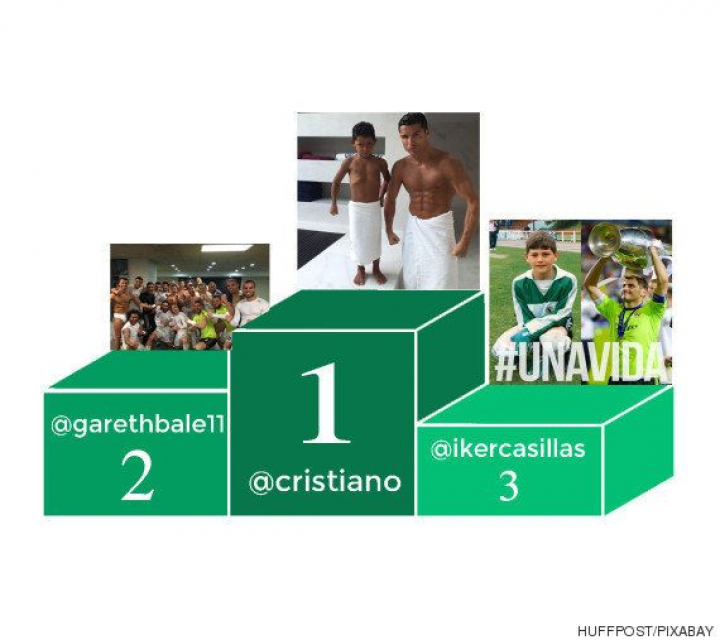 En cuanto a las fotos o vídeos que más han gustado, Cristiano vuelve a colocarse en cabeza. La imagen que colgó en agosto del año pasado en la que salía junto a su hijo presumiendo de abdominales ha alcanzado los dos millones de Me gusta. La foto del vestuario del Madrid —en la que algo detrás de Marcelo distrae las miradas— de Bale tras ganar el clásico en el Camp Nou y un mensaje de despedida de Iker Casillas del Real Madrid en julio de 2015 completan el podio.
