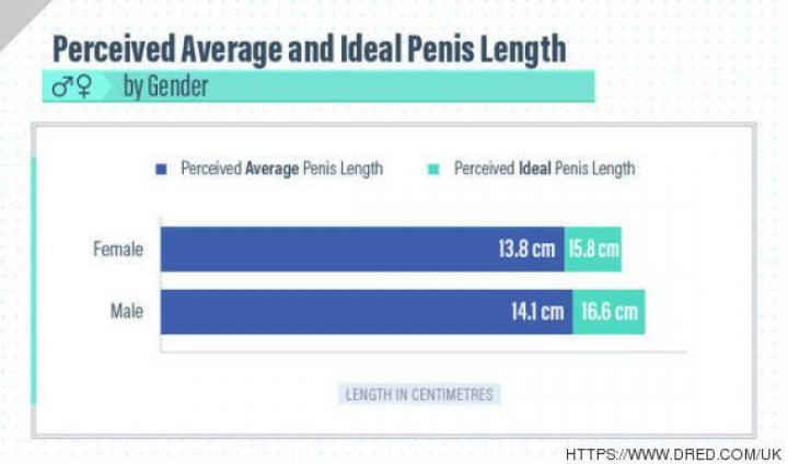 Según se muestra en el gráfico, en general, las mujeres perciben que la longitud media del pene es de unos 13,8 centímetros y que el tamaño del pene ideal debería ser de unos 15,8. Los hombres, por otro lado, piensan que la longitud media del pene es de unos 14,1 centímetros y que la longitud ideal sería de 16,6.