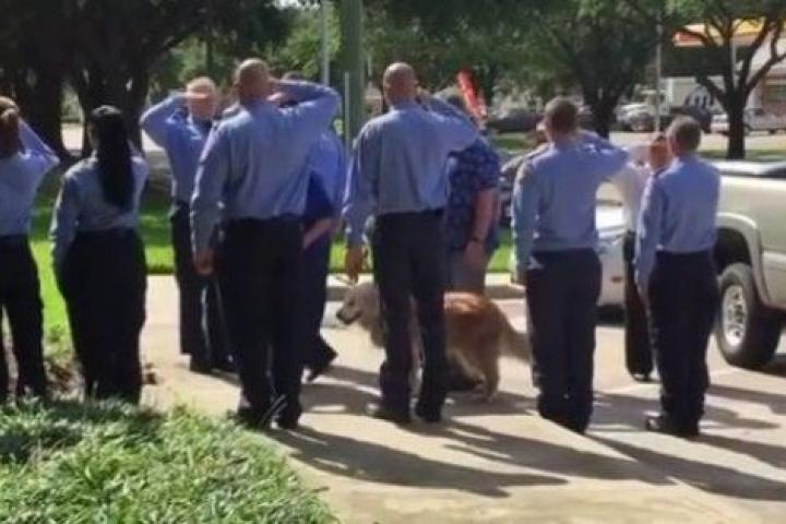 En el vídeo de su despedida, podemos ver cómo los bomberos forman un pasillo humano y hacen el saludo militar, mientras la perra camina despacio hacia el veterinario.