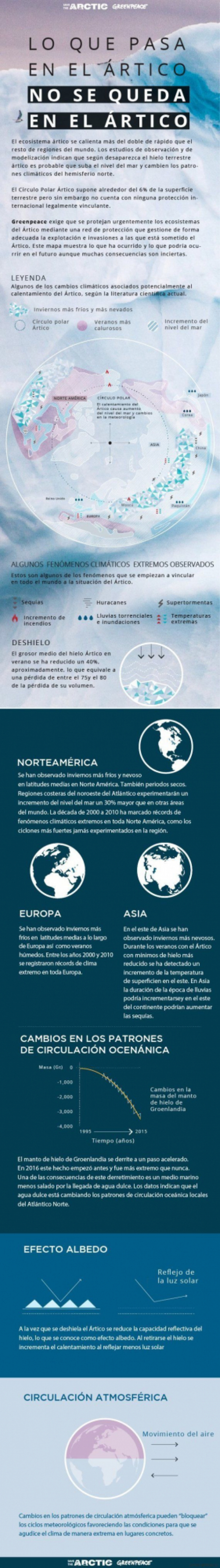"La temperatura en el Ártico aumenta más del doble de rápido que cualquier otra región del mundo, la superficie total de hielo marino de verano ha disminuido sustancialmente durante los últimos 30 años, y su volumen se ha reducido de manera aún más acentuada. Esto significa que se intercambie más calor entre el océano Ártico y la atmósfera circundante y que la capacidad de reflejo del hielo (el conocido como efecto albedo de la superficie) se reduce en una espiral perniciosa. Esto se agrava con el deshielo del permafrost en las zonas de tierra, que provoca la liberación de gases de efecto invernadero como el metano, lo que acelera más el cambio climático global", relatan.