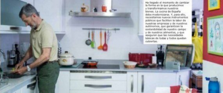 En las páginas del programa aparecen los dirigentes de la formación morada fotografiados en sus casas y despachos anunciando las propuestas. Así, en el apartado de cocinas una fotografía del cabeza de lista por Almería, el ex jefe del Estado Mayor de la Defensa (JEMAD) Julio Rodríguez, fregando los platos anuncia que ha llegado el momento de cambiar la forma en la que producimos y transformamos nuestros bienes.