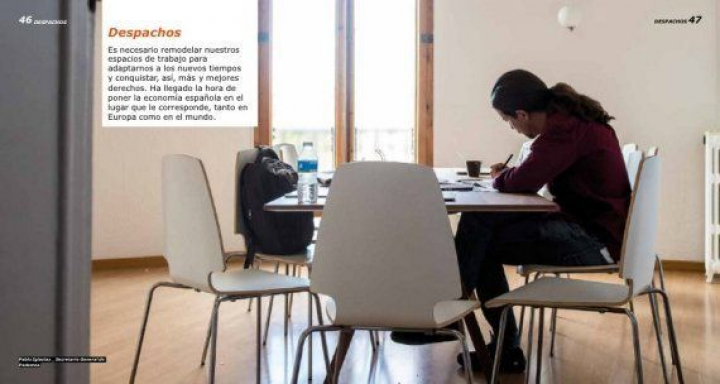 El parecido es buscado e incluso en algunas páginas, bajo el epígrafe de 'despachos', se puede leer: "Es necesario remodelar nuestros espacios de trabajo para adaptarnos a los nuevos tiempos y conquistar, así, más y mejores derechos. Ha llegado la hora de poner la economía española en el lugar que le corresponde, tanto en Europa como en el mundo".