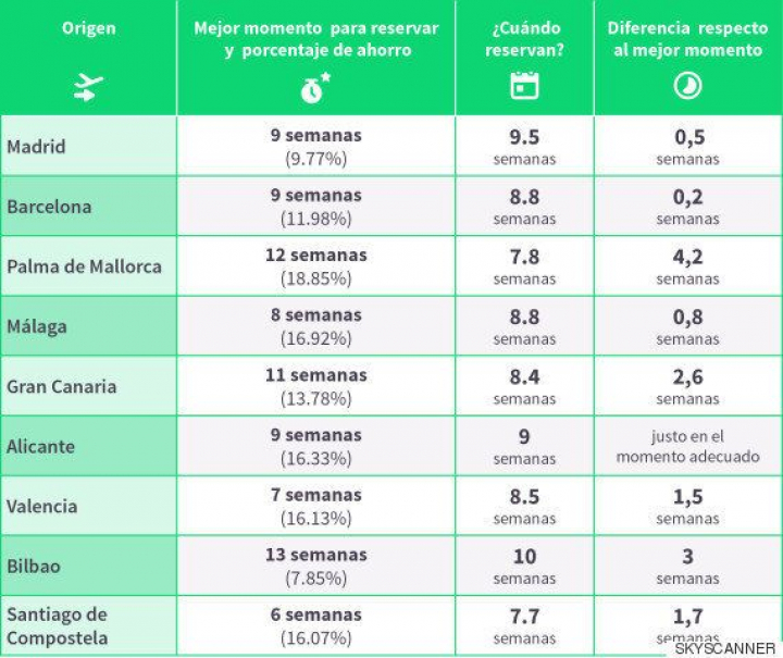 La primera semana de agosto es en la que más desplazamientos se esperan este verano. Quedan siete semanas para esa fecha en la que muchos españoles comenzarán sus vacaciones y justo ahora es el mejor momento para reservar vuelos a precios más económicos. Según el buscador Skyscanner, con esta antelación se pueden obtener billetes un 9,7% más baratos de media.