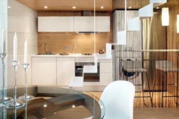 7. Si cuentas con un espacio a diferente altura, distribuye los ambientes en distintos planos. Conseguirás crear cierta independencia entre cada zona, como en este caso, en el que el salón se ubica en la parte más baja y el comedor y la cocina, en la superior, tan solo separados por tres escalones.