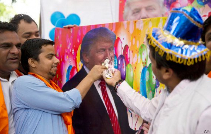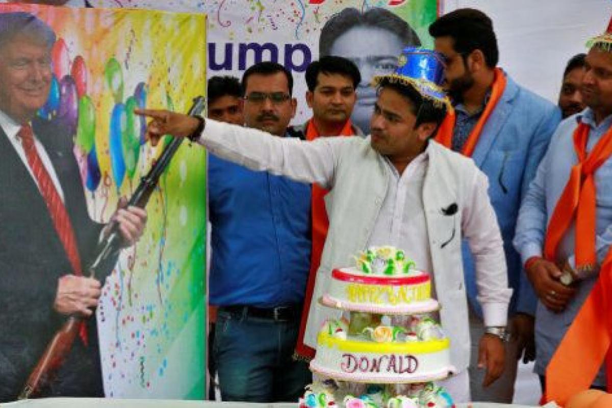 Con globos de colores, cantando y partiendo una tarta, miembros de la formación ultraderechista Hindu Sena han celebrado este martes el cumpleaños del virtual candidato republicano a la presidencia de los Estados Unidos, Donald Trump, al que consideran el "salvador de la humanidad".