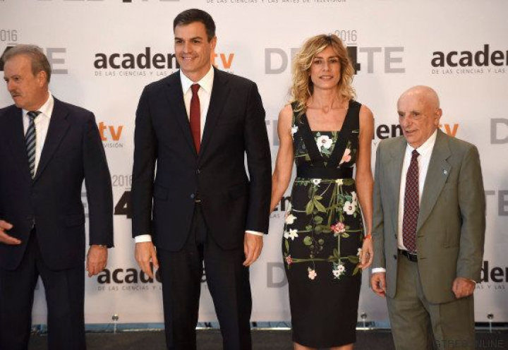 El candidato socialista llegó hasta el debate andando, dando un pequeño paseo, de la mano de su esposa Begoña Gómez. Además de ella y de su equipo, le acompañó por primera vez su hermano. Pocos metros antes la pareja se separó y el candidato socialista acudió a saludar a los manifestantes de RTVE que buscan mejorar la televisión pública y cuyas pitadas se escucharon a lo largo de todo el informativo.