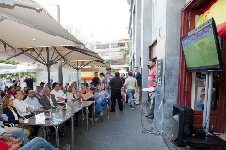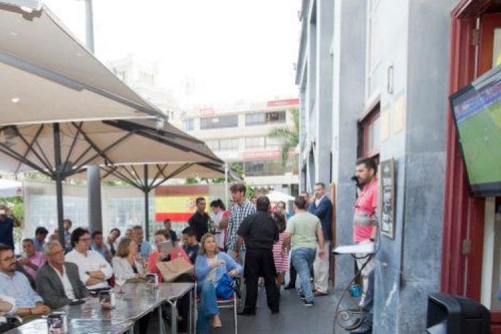 Rajoy ha seguido el partido desde la terraza de un bar en Tenerife, donde este sábado tendrá un acto electoral. El líder del PP ha llegado, se ha sentado allí y se ha puesto a ver el encuentro... sin pedir nada. Las mesas que ocupan tanto él como su equipo están prácticamente vacías. 11 personas y una sola copa.