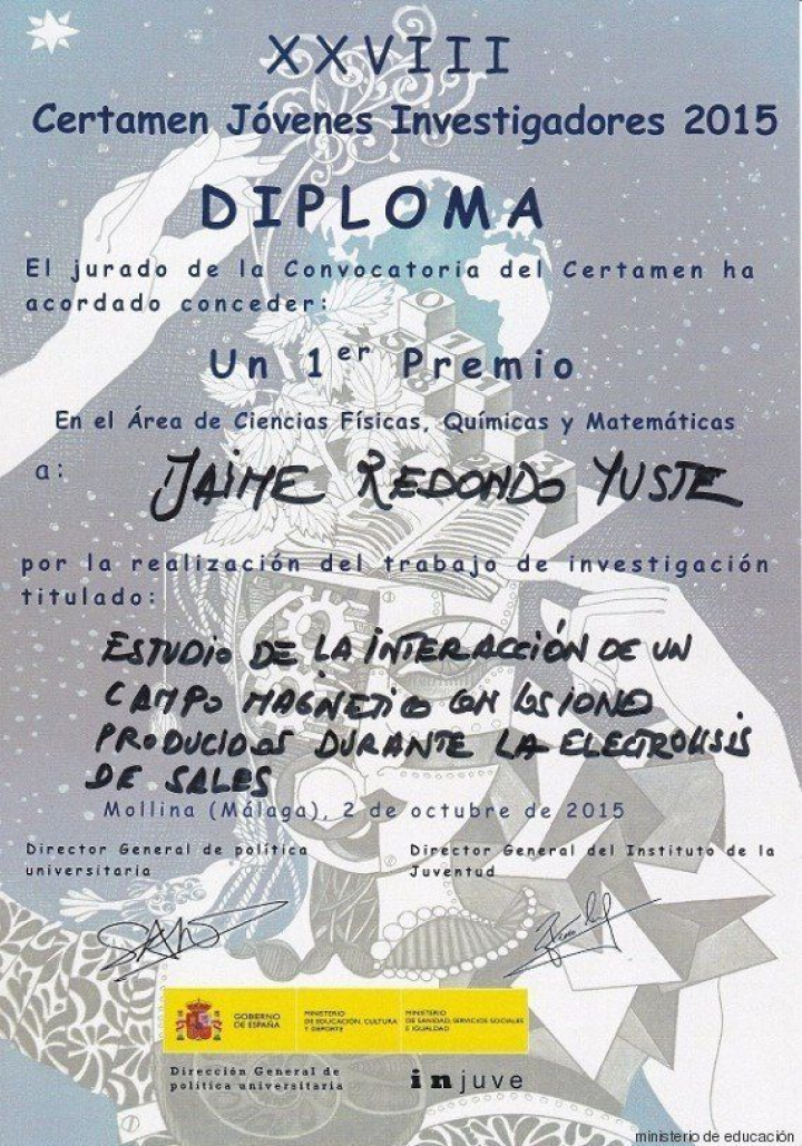 Jaime Redondo Yuste fue ganador del primer premio del XXVIII Certamen Jóvenes Investigadores 2015 convocado por la Secretaría de Estado de Educación, Formación Profesional y Universidades.