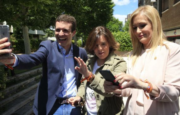 El vicesecretario de comunicación del Partido Popular, Pablo Casado; la vicepresidenta en funciones del Gobierno Soraya Sáenz de Santamaría y la presidenta de la Comunidad de Madrid, Cristina Cifuentes han protagonizado la imagen graciosa de la jornada.