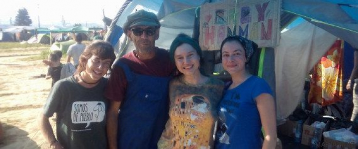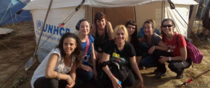 Parte del grupo de voluntarios de las hermanas Ruiz; aunque posan ante una tienda del ACNUR, aseguran que la agencia de la ONU para los refugiados no estaba presente en Idomeni, encontraron la carpa abandonada y decidieron ocuparla.