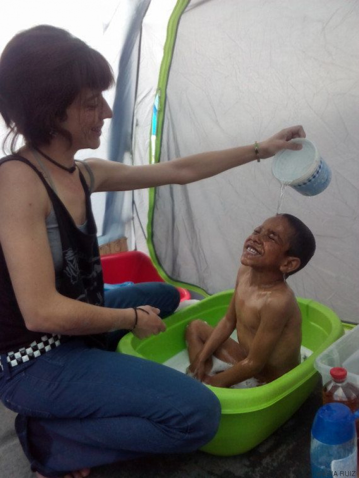 "Compraron unas bañeras y dividieron el espacio interior de la tienda. Bañábamos cada día a unos 130 niños; algunos llevaban hasta tres meses sin lavarse. Les echábamos productos para los piojos, mirábamos si tenían algún problema o enfermedad para mandarlos a Bomberos en Acción. Les poníamos ropa limpia, repartíamos gorras y protección solar", detalla.