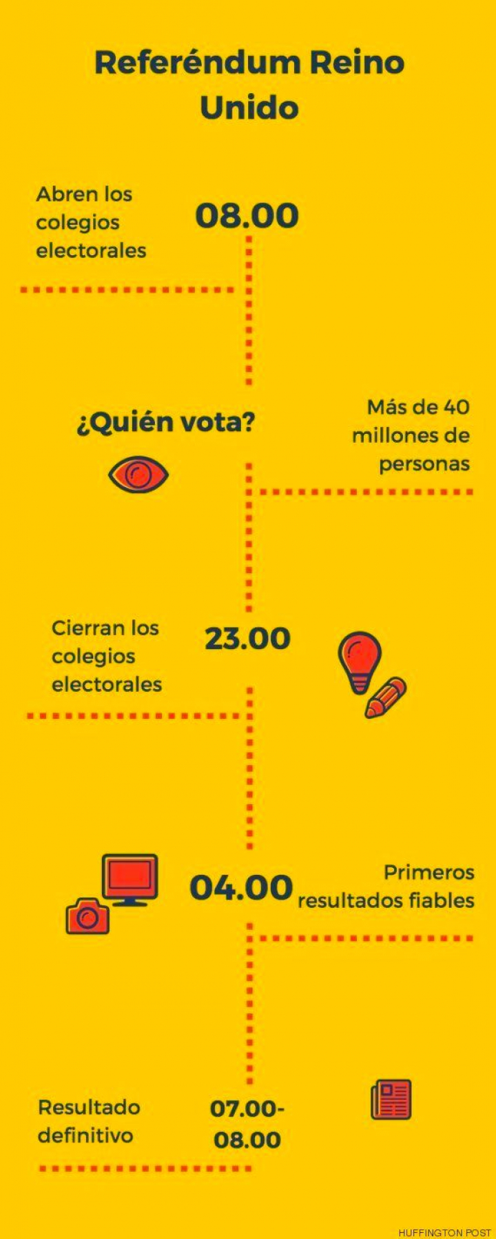 No, lo sentimos, no te irás a la cama el jueves sabiendo si Reino Unido sigue siendo o no del club europeo. El recuento empezará tan pronto cierren los colegios, pero no se espera que los sondeos de algún resultado más o menos fiable hasta las 05.00 horas (española). Eso sí, el resultado definitivo no se anunciará hasta las 07.00-08.00 horas, cuando lo haga público la presidenta de la Comisión Electoral, Jenny Watson, en Manchester (norte de Inglaterra).