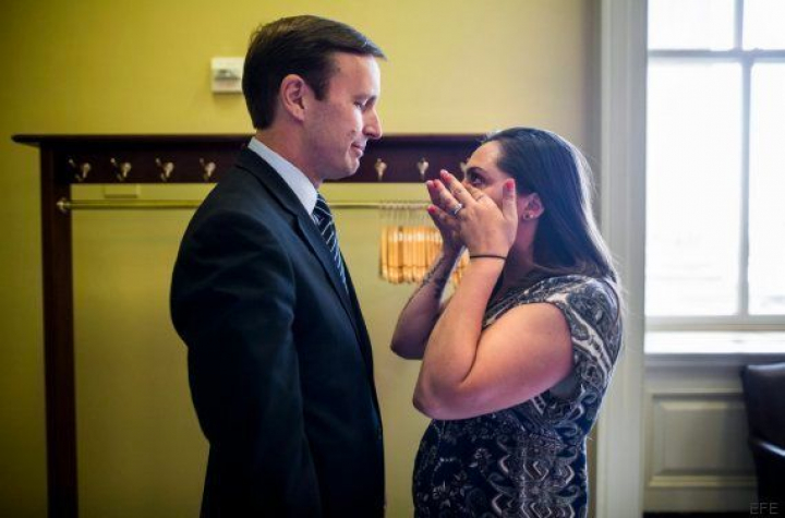 El senador demócrata Chris Murphy (i) da la noticia de la votación a la hija de Dawn Hochsprung, muerto en la Escuela Primaria Sandy Hook
