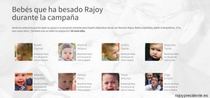 En la web dedicada a Rajoy, también podemos ver varias secciones, como una dedicada a los "bebés que ha besado Rajoy durante la campaña", entre los que se incluye al número dos de Podemos, Íñigo Errejón: