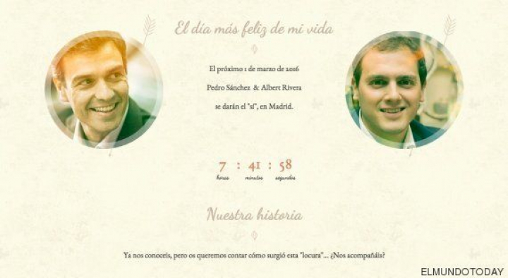 También dedicaron una página al pacto entre PSOE y Ciudadanos (investidurapedrosanchez.es) en el que imitaban una invitación de boda: