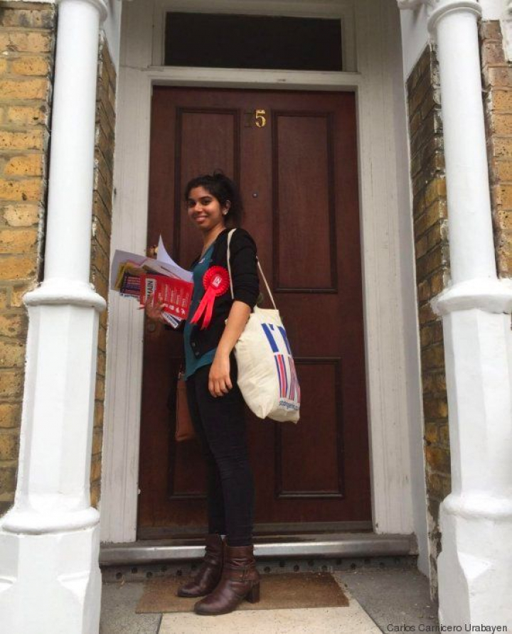 Anjali, la joven laborista de 23 años, le interesa conversar sobre las elecciones del domingo en España. "He votado por correo antes de venir a Londres a hacer campaña". Anjali, nacida en Málaga de padres indios y criada en Ghana, se juega mucho en esta campaña británica aunque no puede votar. "Me juego no poder volver aquí al Reino Unido donde viví siete años y mantengo muchos vínculos", cuenta a El Huffington Post en español con un fuerte acento inglés.